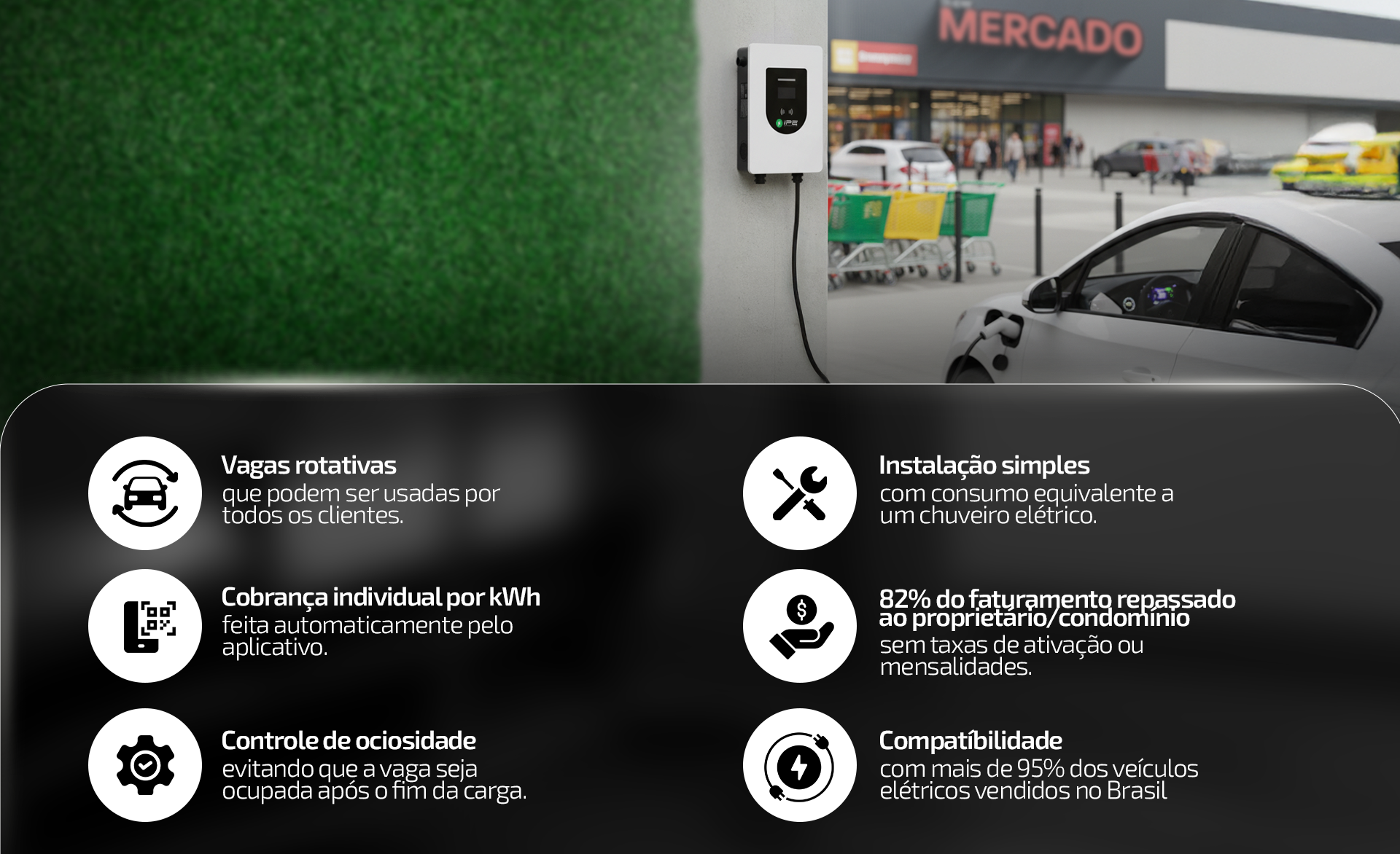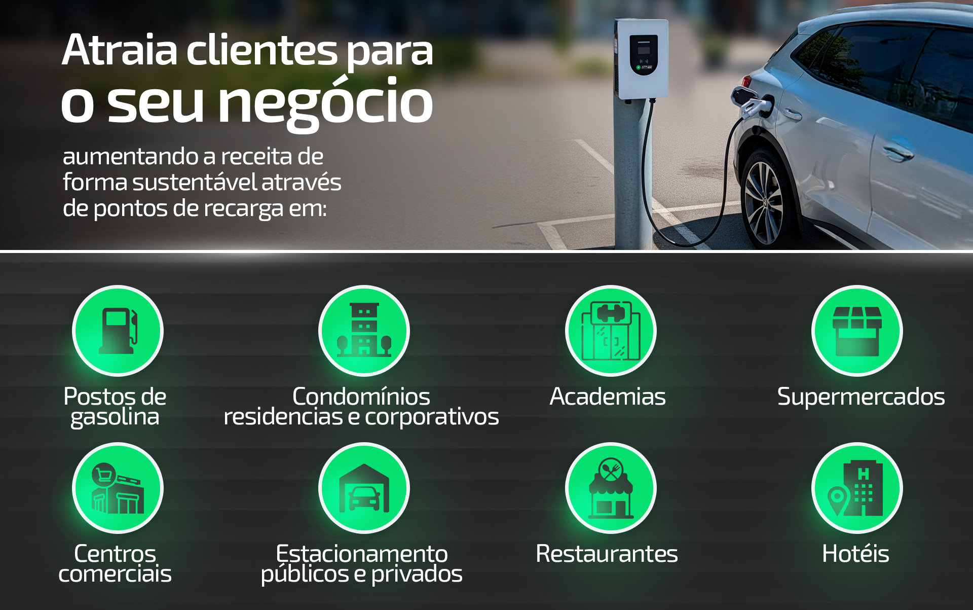 Seja em estacionamentos, shoppings, restaurantes, academias, supermercados, hotéis, postos de combustível, centros comerciais ou qualquer outro ponto comercial, seu carregador estará disponível 24h por dia, 7 dias por semana, gerando receita continuamente.