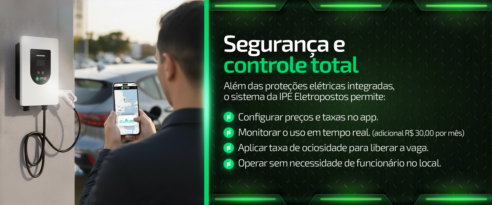 Com os carregadores IPE Eletropostos, seu comércio tem segurança e controle total. Além das proteções elétricas integradas, o sistema permite configurar preços, aplicar taxas de ociosidade e acompanhar tudo em tempo real pelo app. É autonomia para o seu negócio e praticidade para o cliente.