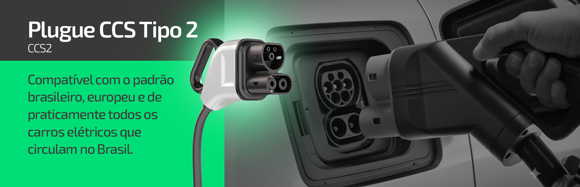 O plugue CCS Tipo 2 (CCS2) é um padrão global usado na Europa e no Brasil que permite carregamento em corrente alternada e contínua no mesmo conector.